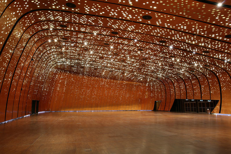 “A lot of inspiration was taken from Islamic architecture, believe it or not,” Nasir says. “The rammed earth for instance – seen throughout the interior of the center, and especially in the atrium and near the Great Hall – is based on the old, traditional architecture in the region, like mud brick houses,” he explains. “The steel tubes on the building’s exterior also took inspiration from the concept of Mashrabiya screens, allowing light to come through while providing shade,” he says.