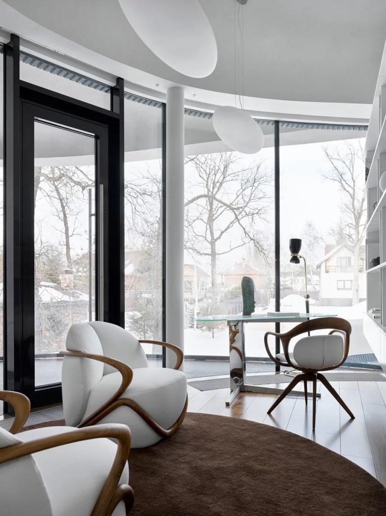 The open area also has a round, almost closed shape and is the compositional core of the interior, symbolizing two balanced halves – yin and yang. lighting is organized not only from a functional point of view, but is also the part of organic architecture, emphasizing the architectural features of the building.